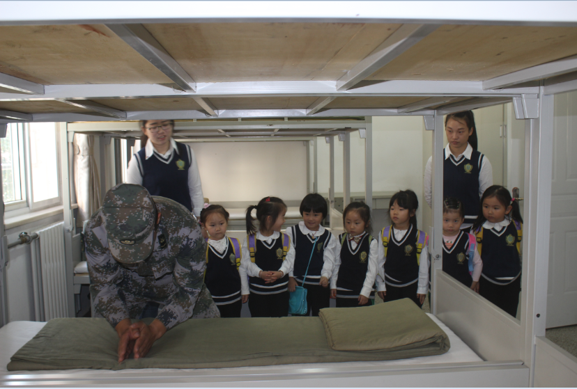 进入营房,室内陈设简单而整齐,床上没有一丝污垢。被子叠得整整齐齐,八个角都呈现直角,似乎是从一个模子里刻出来的。在孩子们正惊异于其运用了什么手法时,解放军叔叔现场表演了叠被子和整理内务,孩子们口中不断重复说着“好整齐、好漂亮”。从整理内务中孩子们感受到部队严明的纪律和阳光向上的好风气。